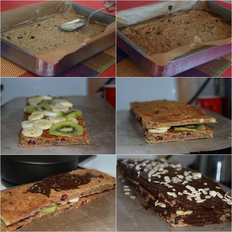 И оваа торта испадна сосема случајно од тоа што имав во кујната. За да ја добијам кората искористив неколку здрави намриници. Измеѓу ставив еден ред овошје и тоа кругови банана и кива. Преливот одозгора е чоколаден.