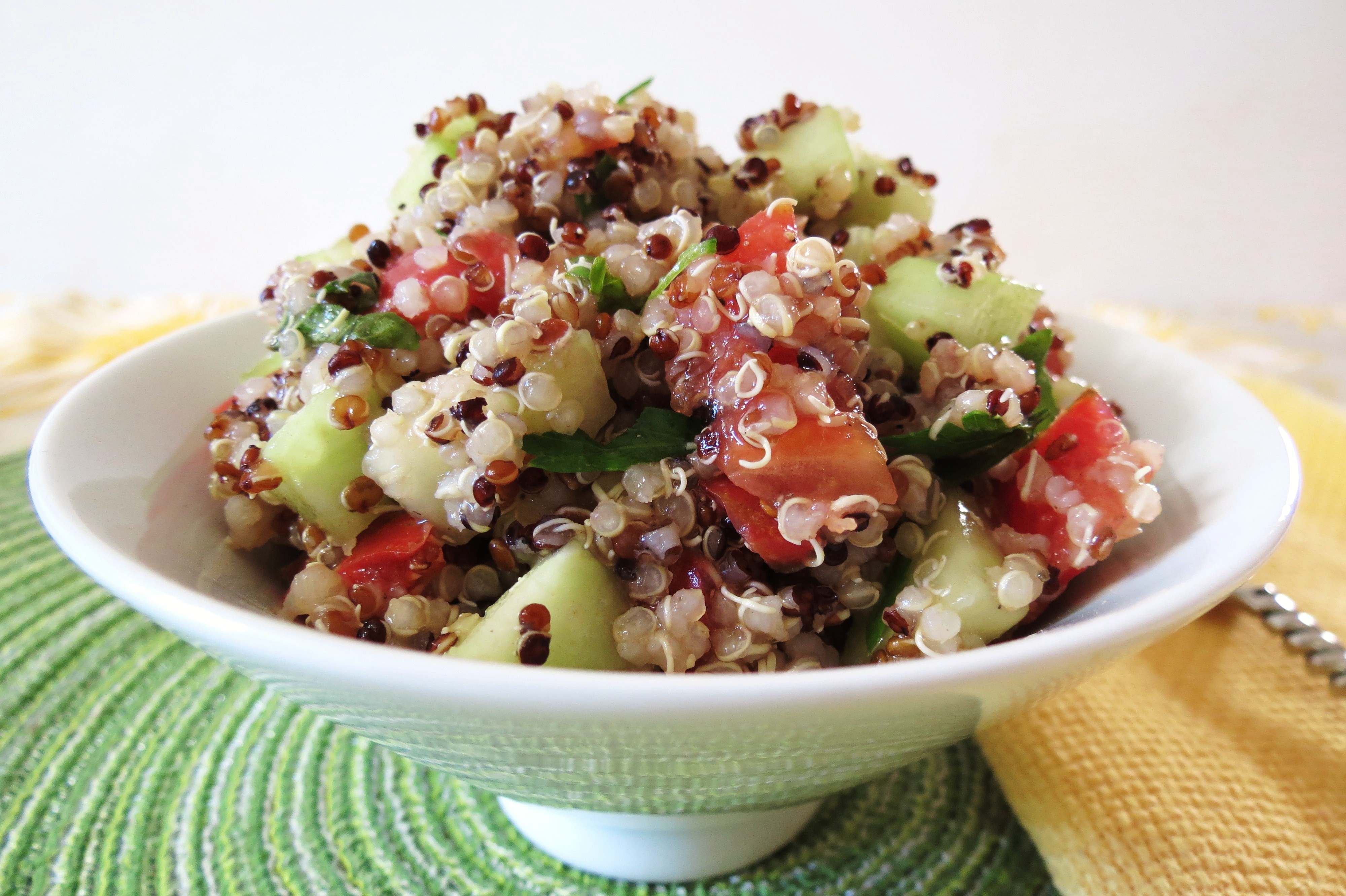 Насечкајте го зеленчукот на парченца и измешајте се заедно. Одозгора додадете ги двете лажици киноа и попрскајте со маслиновото масло и наросете сосема малку сол.