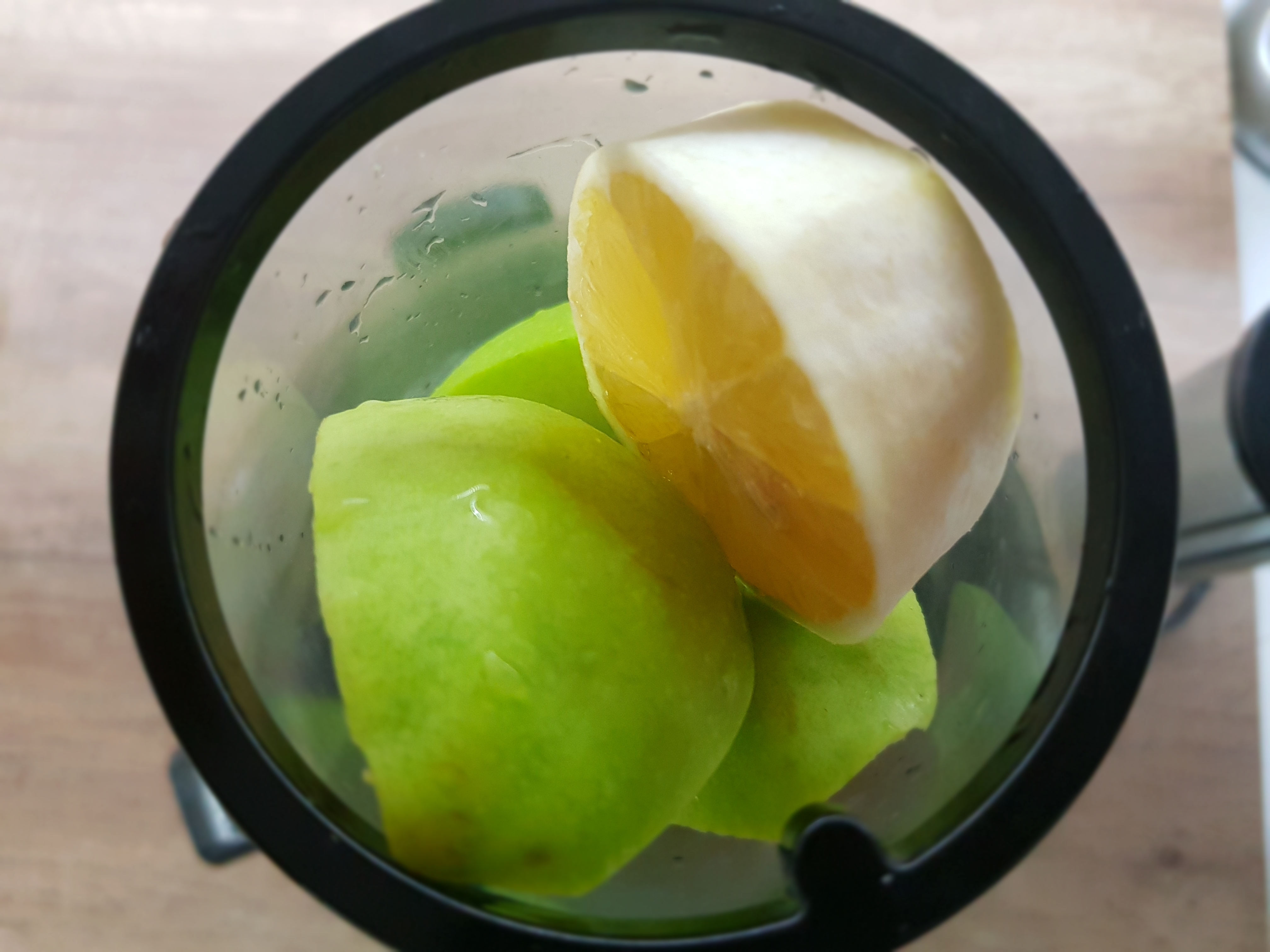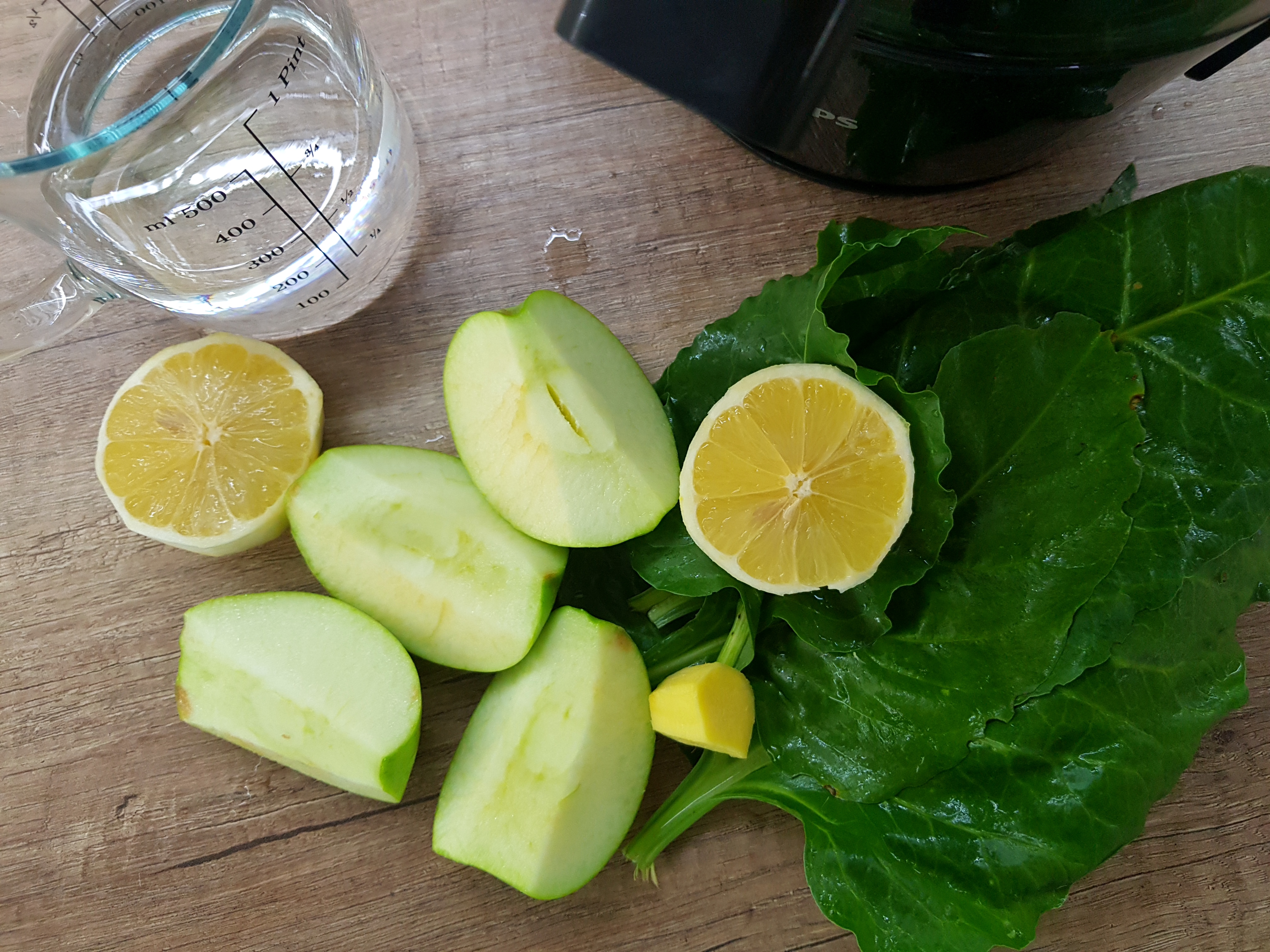 Најпрвин излупете го лимонот, јаболкото пресечете го на половини или пак на четвртини, коренот од ѓумбир излупете го. Ставете ги сите состојки во соковник.