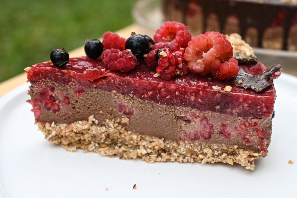 За последниот дел ги ставив малините во тенџере и го додадов кокосовиот шеќер, ги ставив на оган и кога почна да врие мешав интензивно. Од самата топлина се распаднаа и почна смесата да наликува на мармалад. Кога веќе вриеше го додадов агар-агарот и на тивко оставив да вриуцка уште 4-5 минути. Потоа ја истурив оваа смеса врз чоколадниот слој и оставив да се стегне, но сега во обичниот фрижидер. Брзо гелираше и веднаш потоа си украсив со свежи малини, рибизли, стопено чоколадо и мелени лешници.