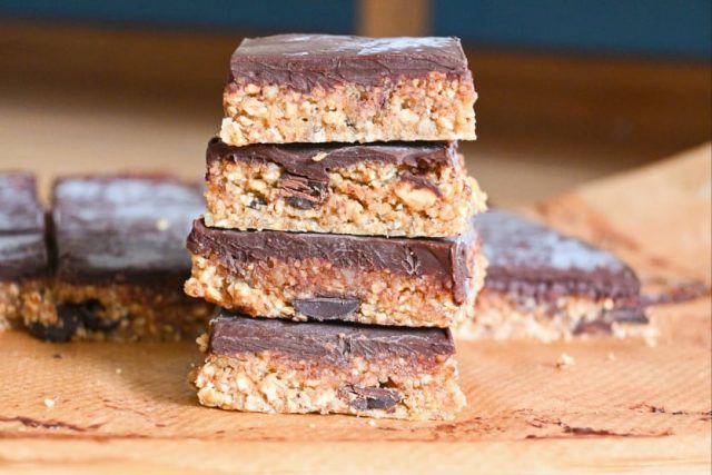 Првин во блендер/процесор ги ставате овесот и јатките и блендирате додека ne добиете убава соединета смеса. Во друг сад го мешате путерот од кикиритки заедно со медот и сокот од портокал. Потоа се заедно соединувате и во таа смеса ставате 50 g чоколаден чипс.