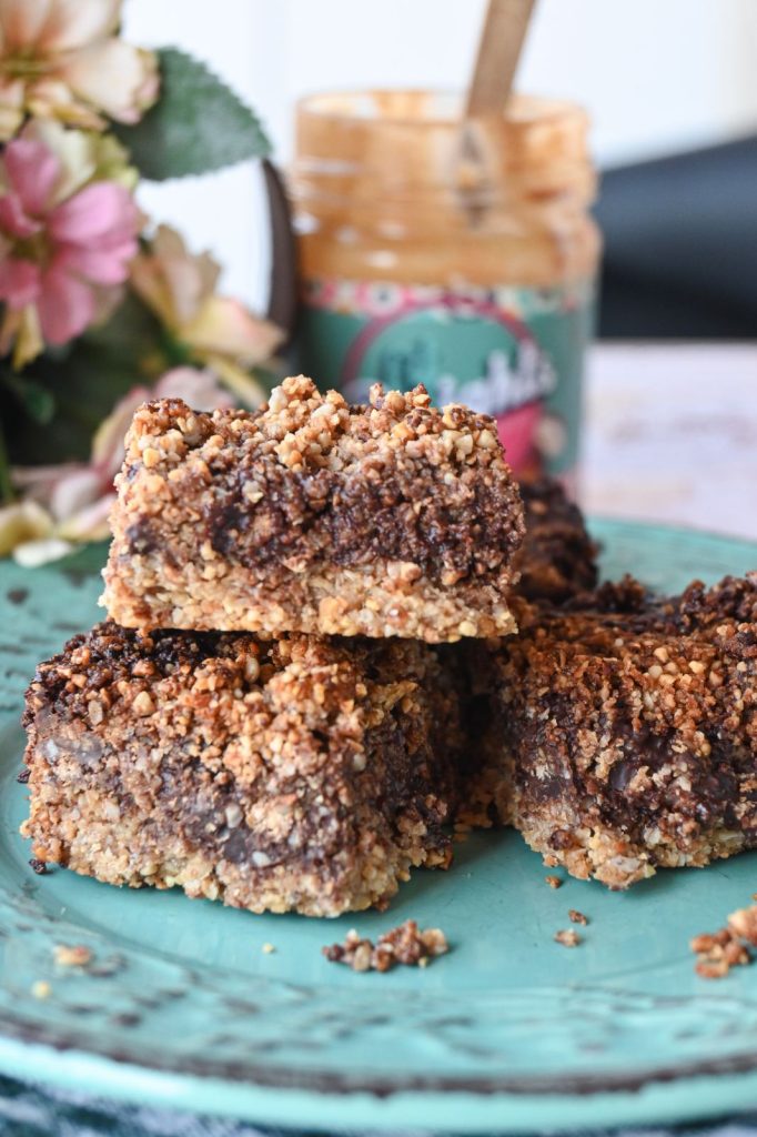 На тивок оган стопете го чоколадото заедно со кокосовото масло, и истурете ја таа смеса врз натапканата кора. Одозгора врз чоколадото ставете го путерот од лешник и остатокот од смесата од кората. Покријте со фолија и ставете во загреана рерна на 160°С да се суши околу 25-30 минути. Не ја вадете фолијата затоа што може лесно да изгори одозгора. Кога ќе го извадите, оставете да се излади, па ставете го во фрижидер да се стегне (не во замрзнувач, во обичниот), па дури тогаш сечете го .