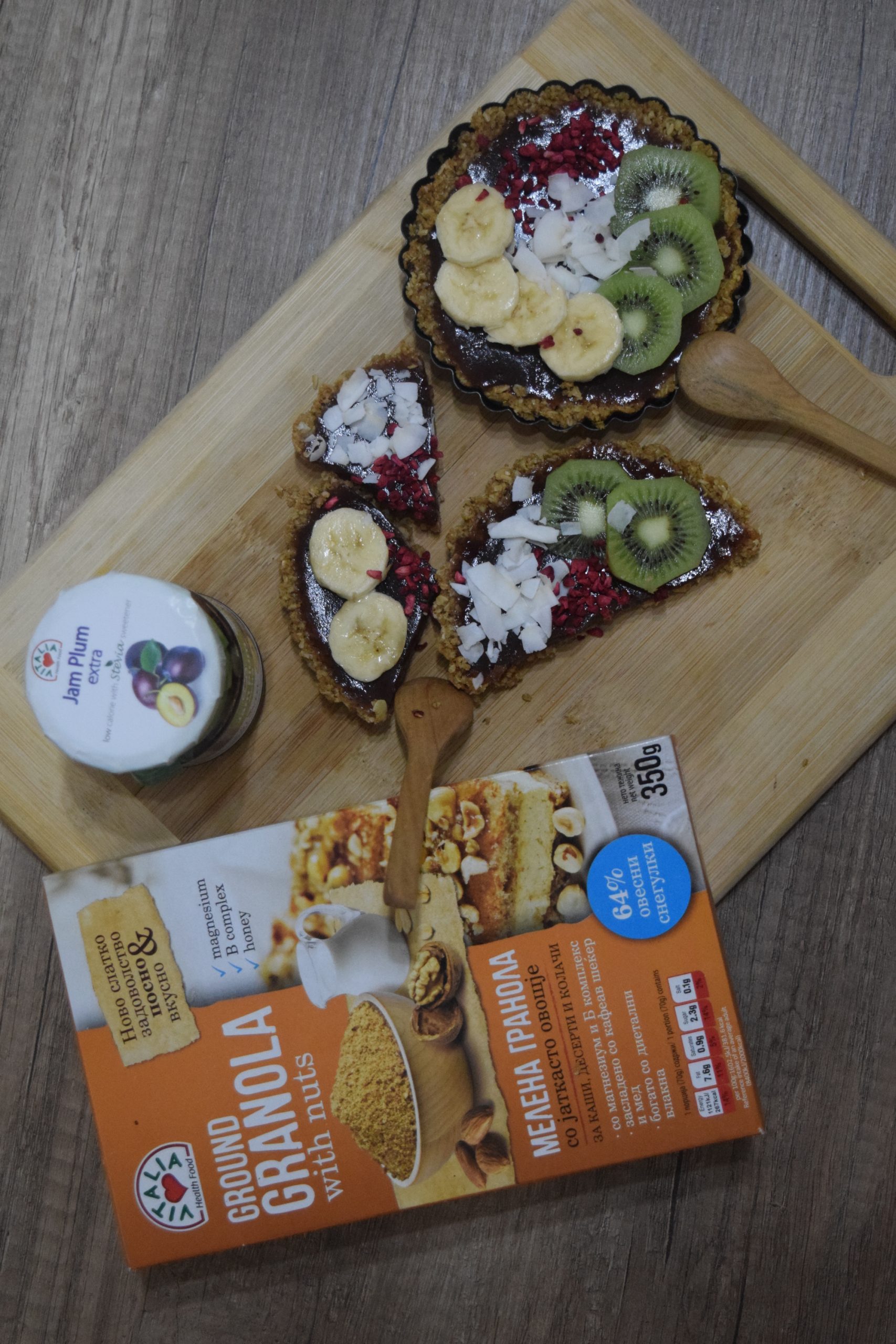 Во рецептот јас користам мелена гранола од Vitalia, но доколку имате обична тогаш ставете ја во блендер или во сецко и иситнете ја. Во гранолата додадете го кокосовото масло и убаво соединете ги двата дела. Во калапчиња за тарт кои можете да ги видите на видеото поделете ја смесата на два дела и убаво натапкајте ја.
