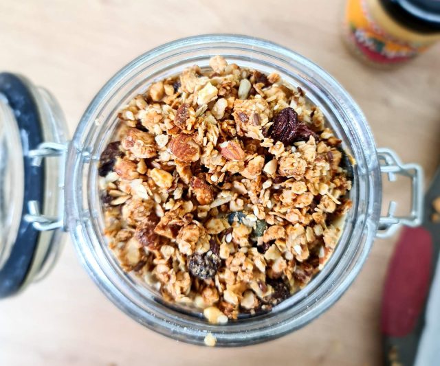 Јас си правам често и имам споделувано неколку рецепти. Секогаш додавам различни работи, зависи што имам дома. Кога е гранолата во прашање најбитни е покрај сувите состојки да имате и влажна смеса која ќе може да ја поврзе целата содржина. Јас најчесто како влажна смеса користам путер од јатки, мед и кокосово масло.