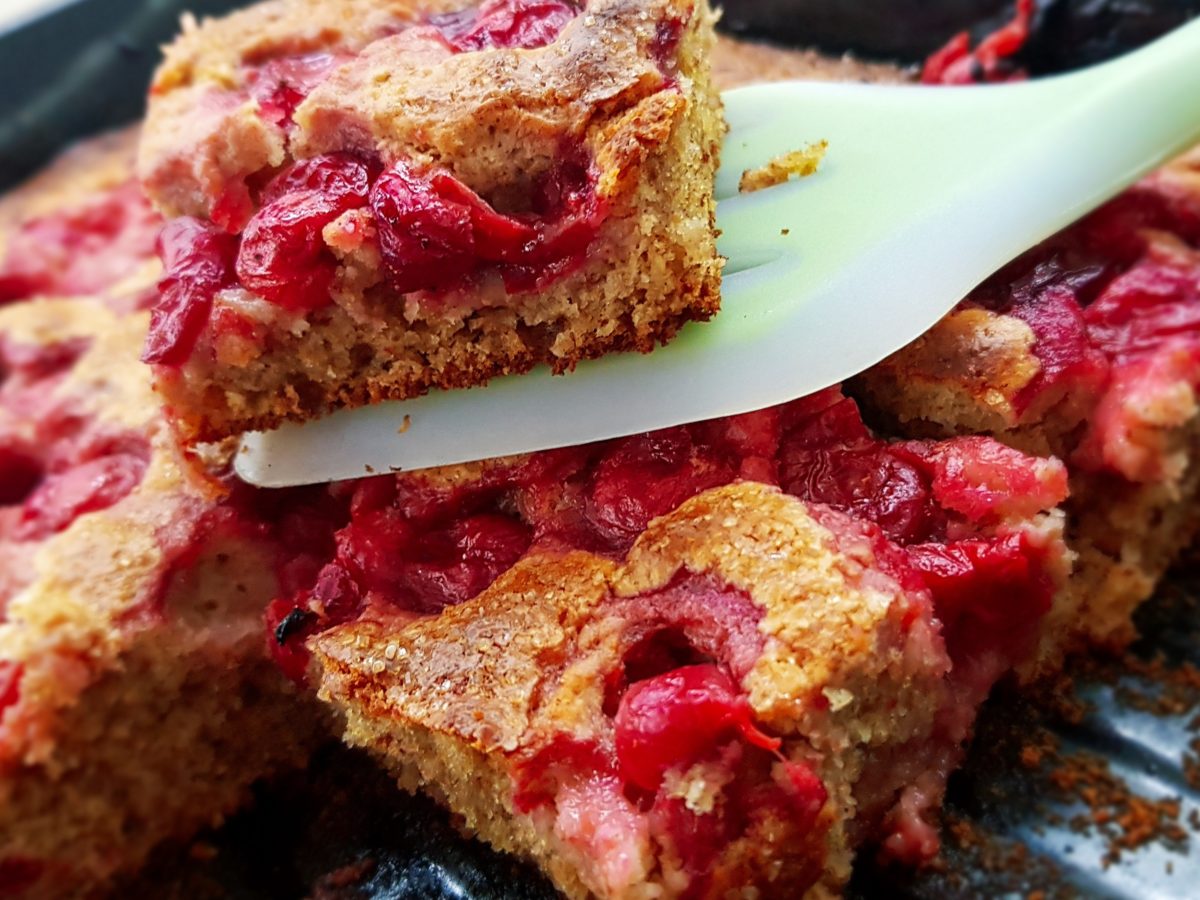 Плехот во кој ќе печеме го премачкуваме со маслиново масло и ја истураме смесата. Одозгора ги расфрламе вишните.