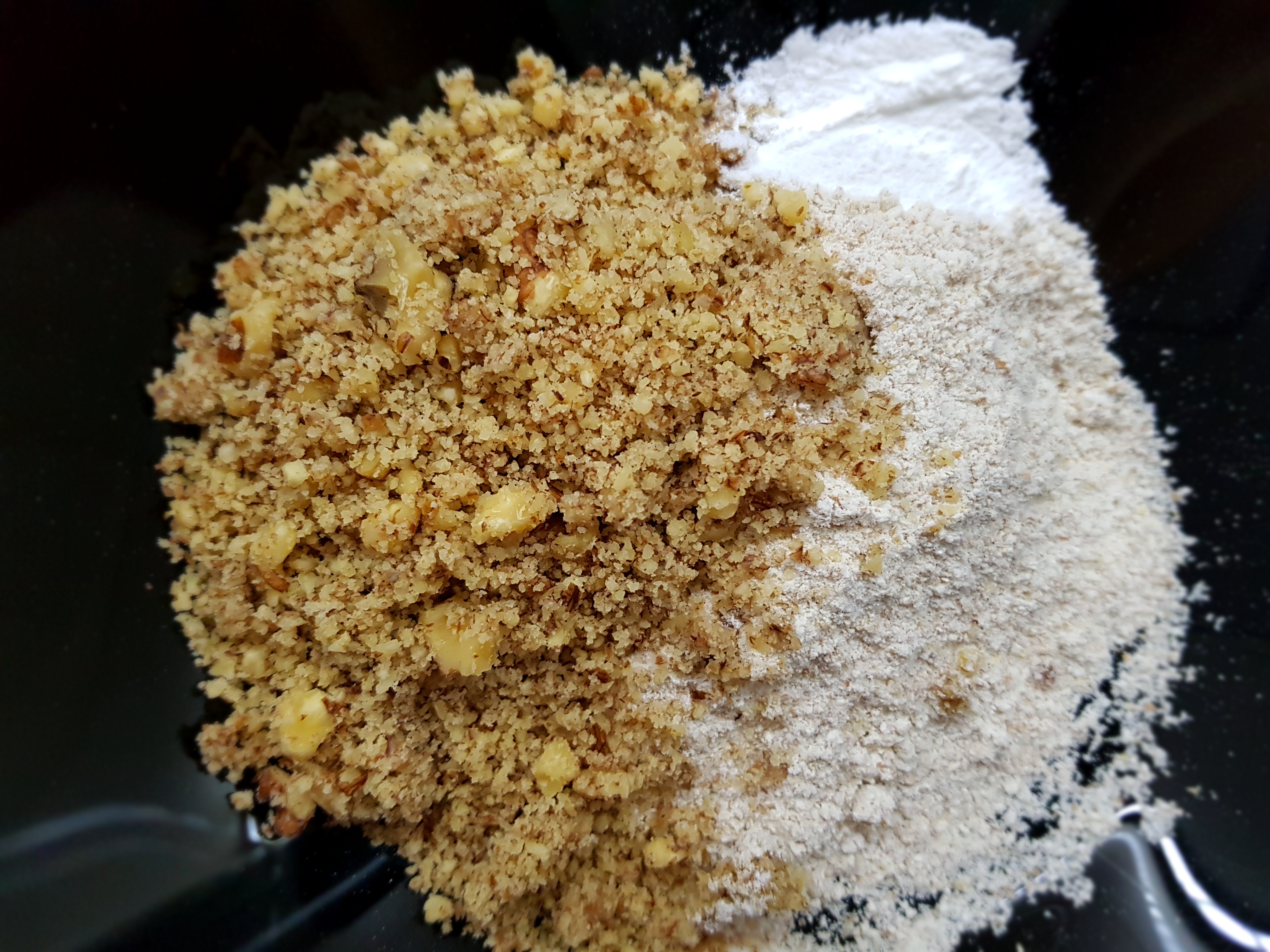 Во длабок сад најпрвин измешајте ги сувите делови: мелените ореви, интегралното брашно и прашокот за пециво.