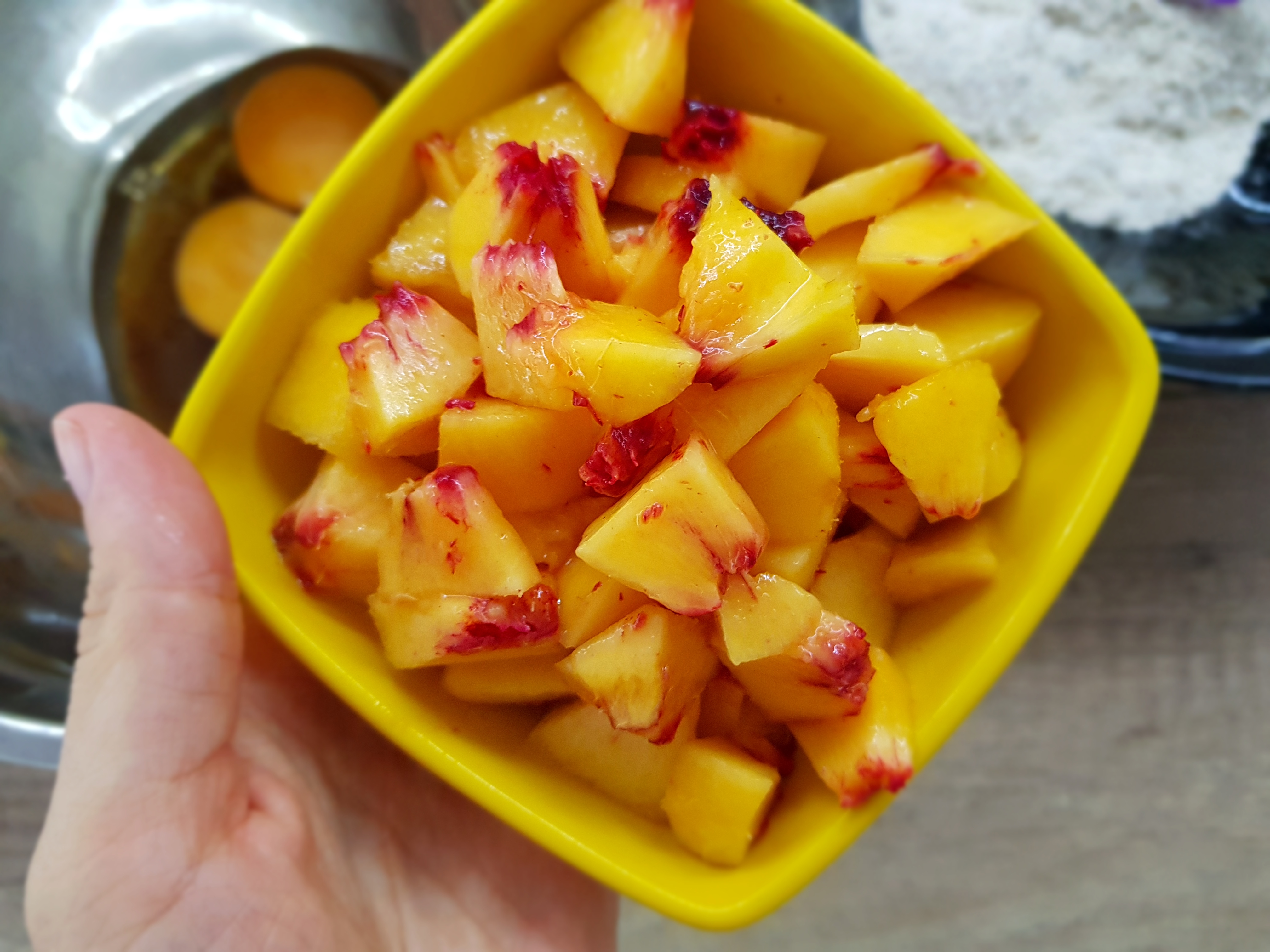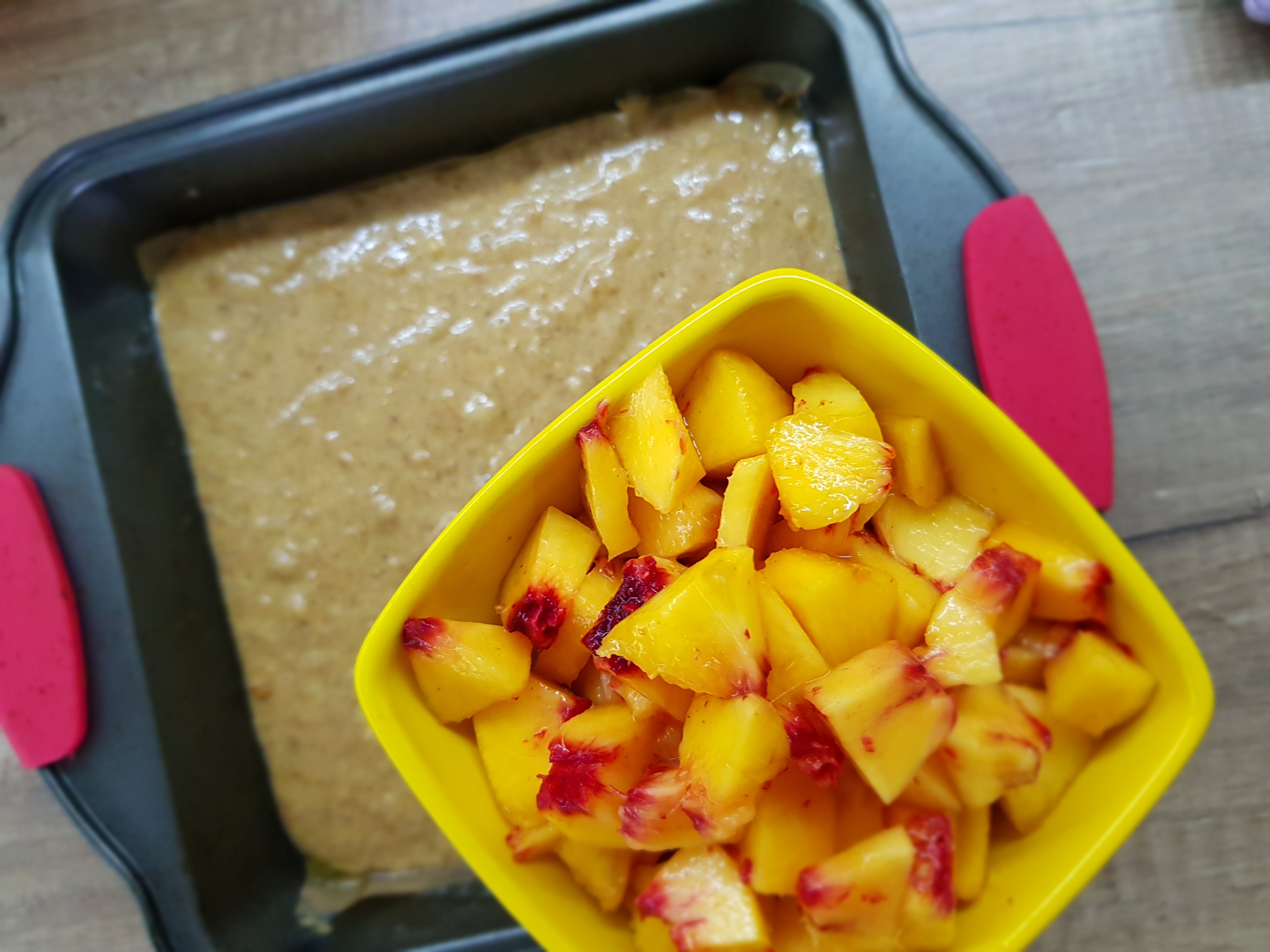 Врз смесата додадете ги праските кои претходно сте ги насечкале на ситни коцки.