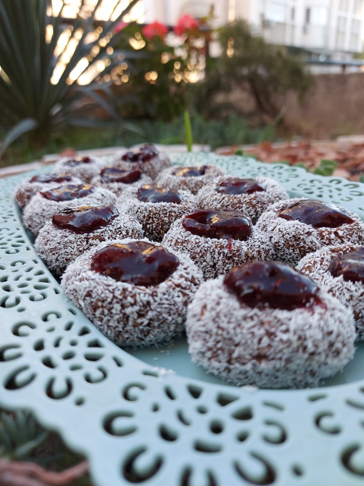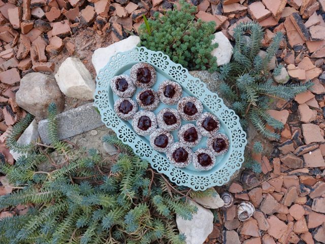 Ставете ги првин во процесот овесните снегулки, оревите, семињата и какаото. Бледнирајте додека не се соединат. Потоа додадете ги урмите, кокосовото масло и водата и продолжете уште малку да блендирате. Кога смесата ќе се соедини формирајте топчиња. На секое топче на средина со прстот направете му дуплче. Ставете во секое дупче џем или пак некој путер од јатки.