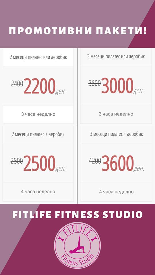 Цената за вежбање кај нас зависи од тоа колку часа неделно вежбате. За два часа неделно цената е 1000 денари без разлика дали е аеробик или пилатес, дури можете еден час да е аеробик а другиот пилатес, 3 часа се 1200, 4 се 1400, 5 се 1600 и 6 часа неделно се 1800 денари. 3 часа неделно утрински пилатес се 1000 денари, а 2 часа утрински пилатес се 800 денари.