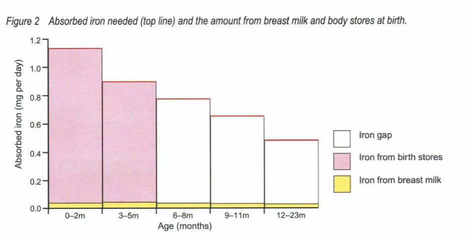 На сликата подолу може да се видат потребите за железо кај новороденчиња, количината на железо која ја добива бебето од мајчиното млеко и резервите кои ги има после раѓањето во однос на месеците – Извадок од WHO Complementary feeding: Family foods for breastfed children.