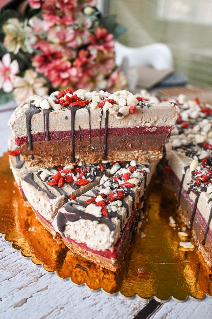 Тортата вака подготвена ставете ја во замрзнувач и почекајте ја да се стегне убаво. Потоа извадете почекајте ја малку за да може да се сече и исчете ја на еднакви парчиња. Јас секое парче го декорирав посебно со темно стопено чоколадо, мелени бадеми и сушени гоџи бобинки.