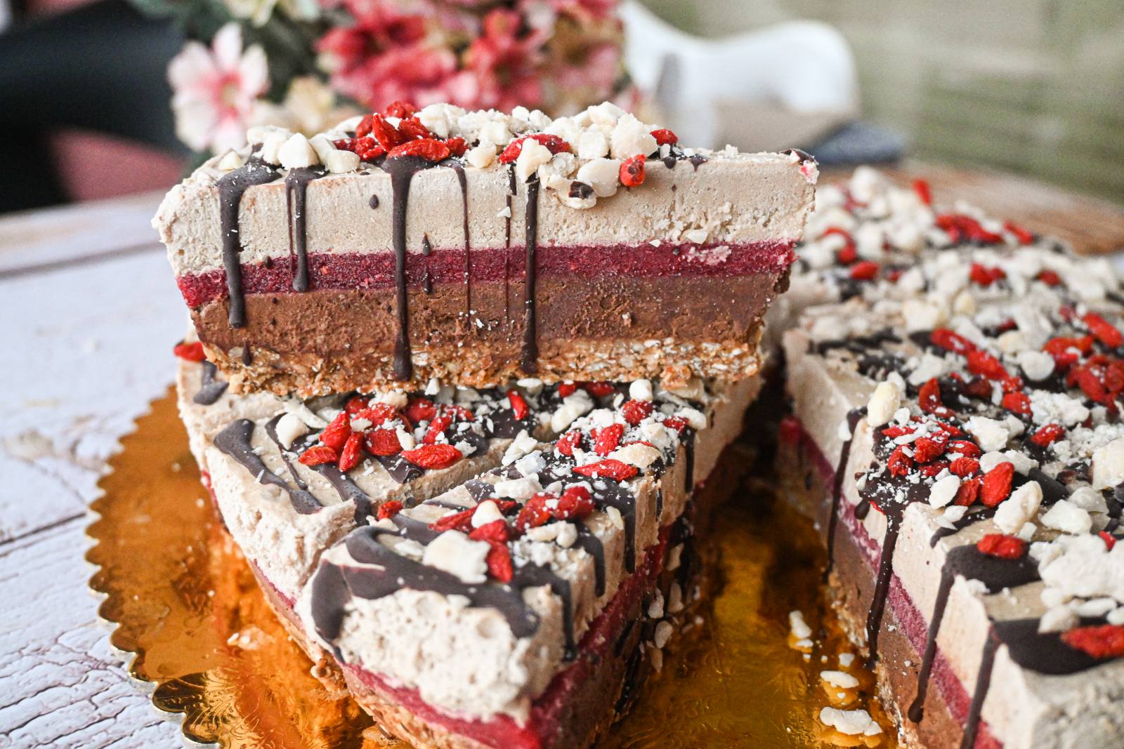 Тортата вака подготвена ставете ја во замрзнувач и почекајте ја да се стегне убаво. Потоа извадете почекајте ја малку за да може да се сече и исчете ја на еднакви парчиња. Јас секое парче го декорирав посебно со темно стопено чоколадо, мелени бадеми и сушени гоџи бобинки.