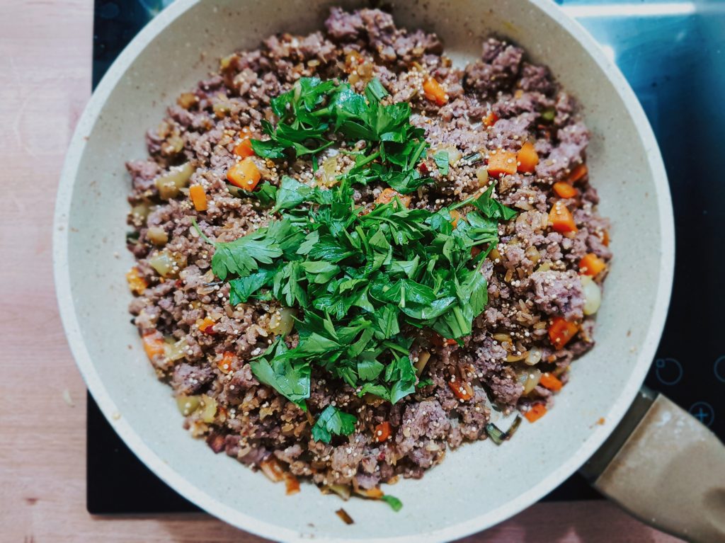 Пиперката, морковот и кромидот ситно се сечкаат и заедно со месото и со малку маслиново масло кратко се запржуваат. На крај се додава киноата, оризот, магдоносот, солта и зачините.
