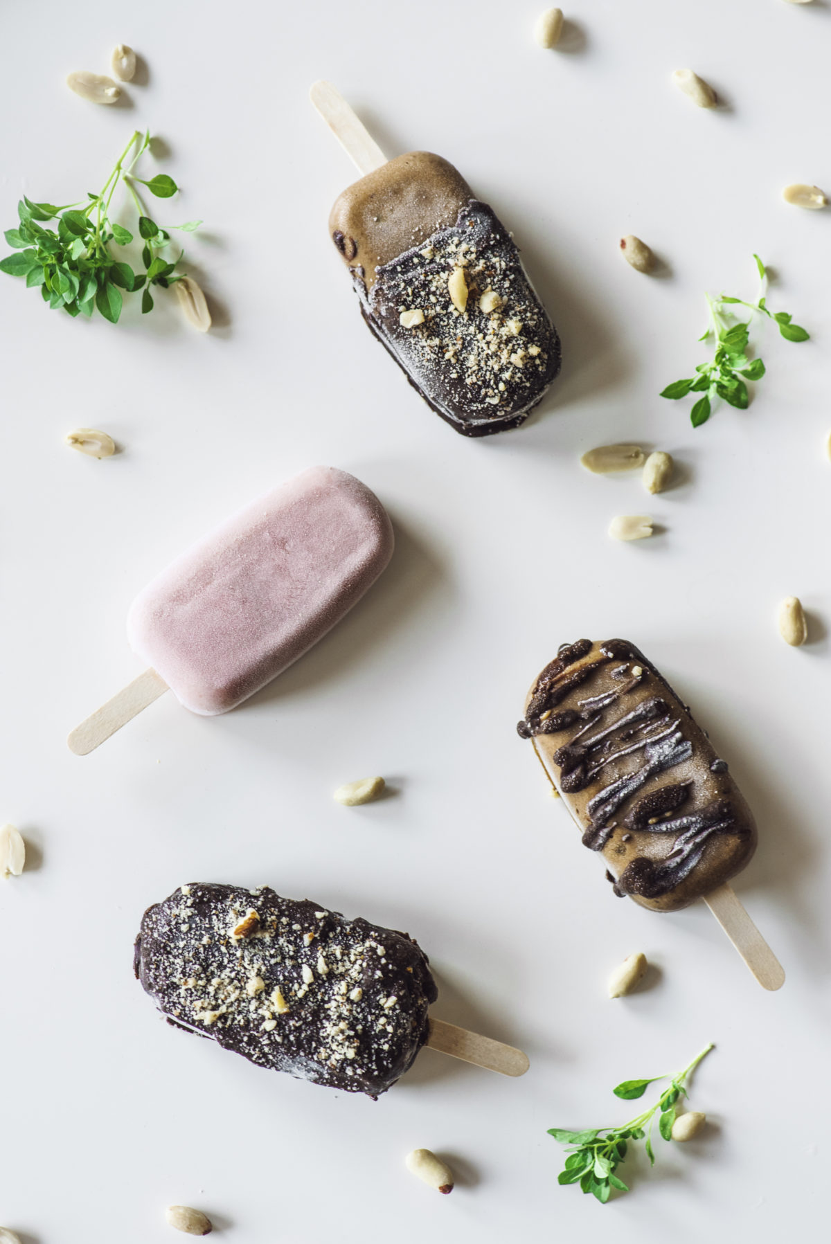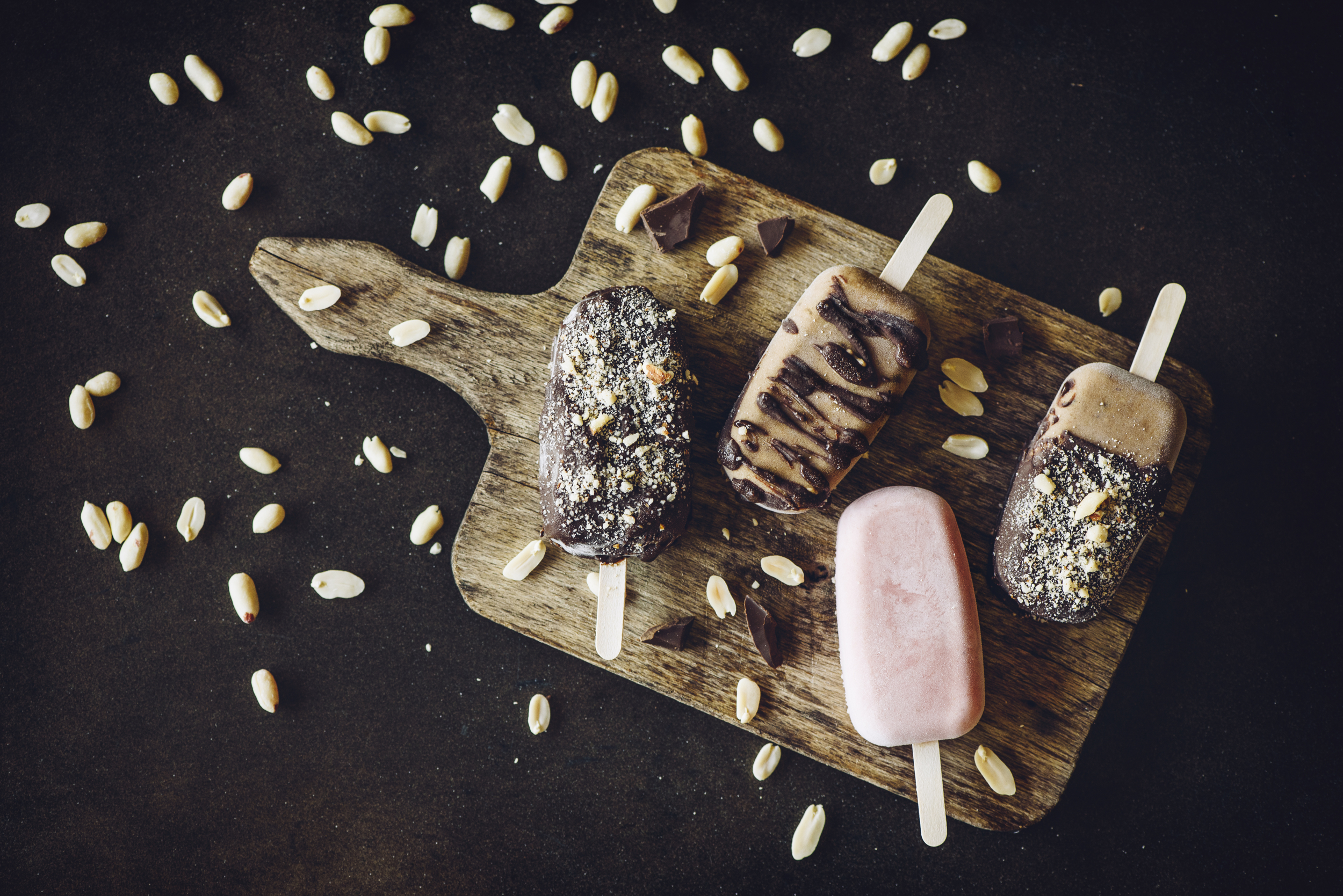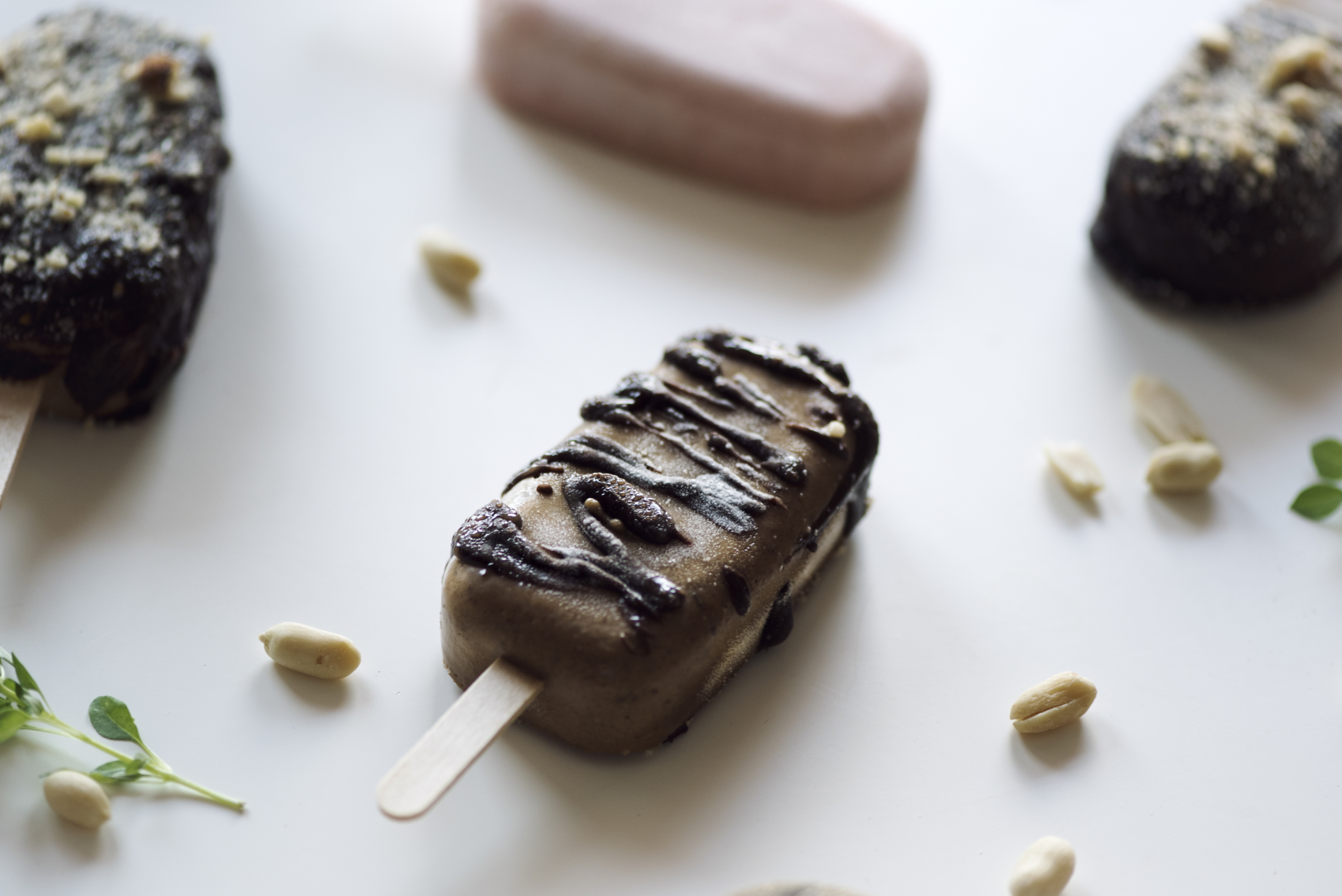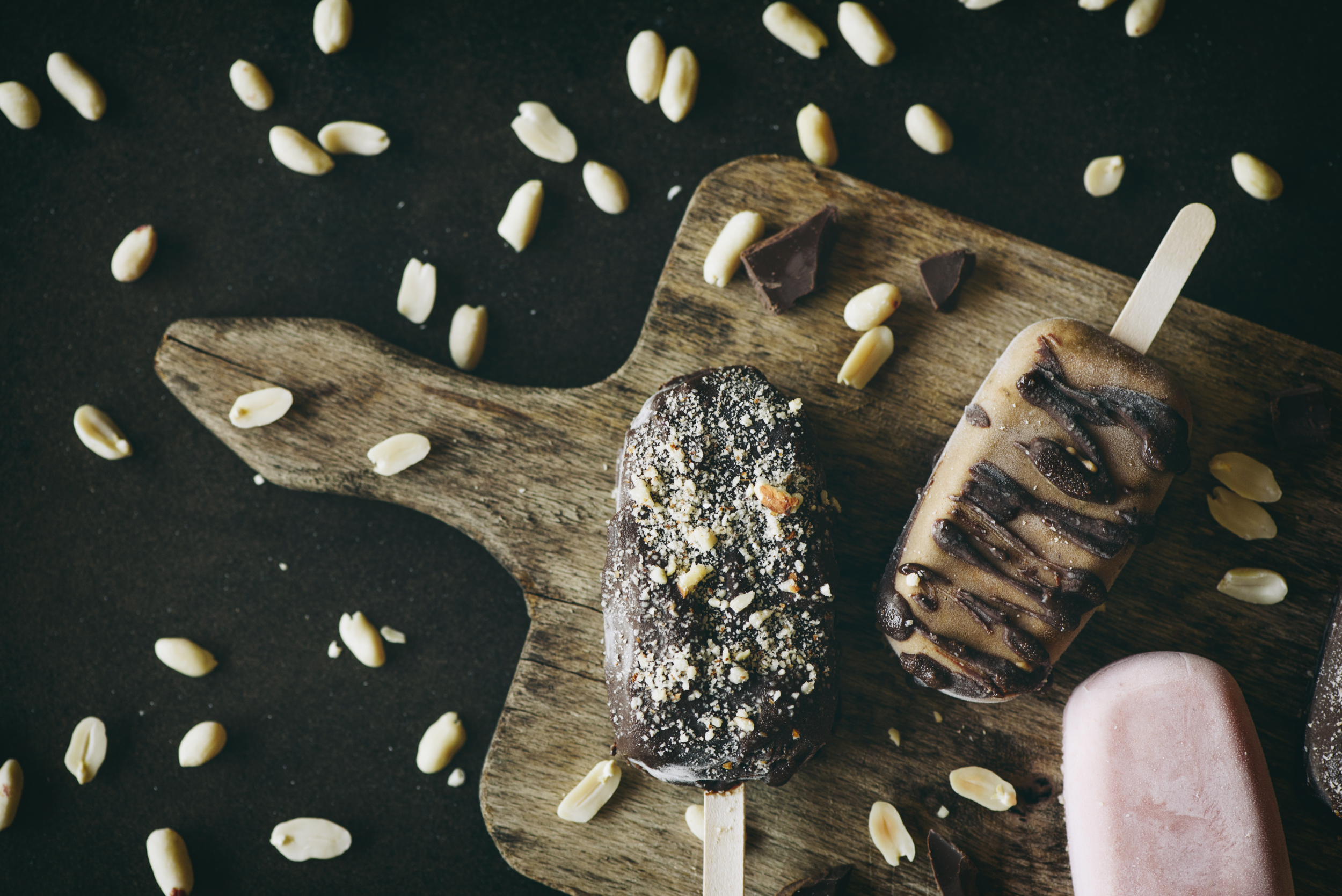 Бананите, путерот од кикиритки и урмите ги ставете во блендер дури не добиете кремаста структура, на крај додадете ги изблендираните или исечкани несолени кикиритки. Ставете ја смесата во силиконските калапи и оставете во замрзнувач минимум 4 часа.