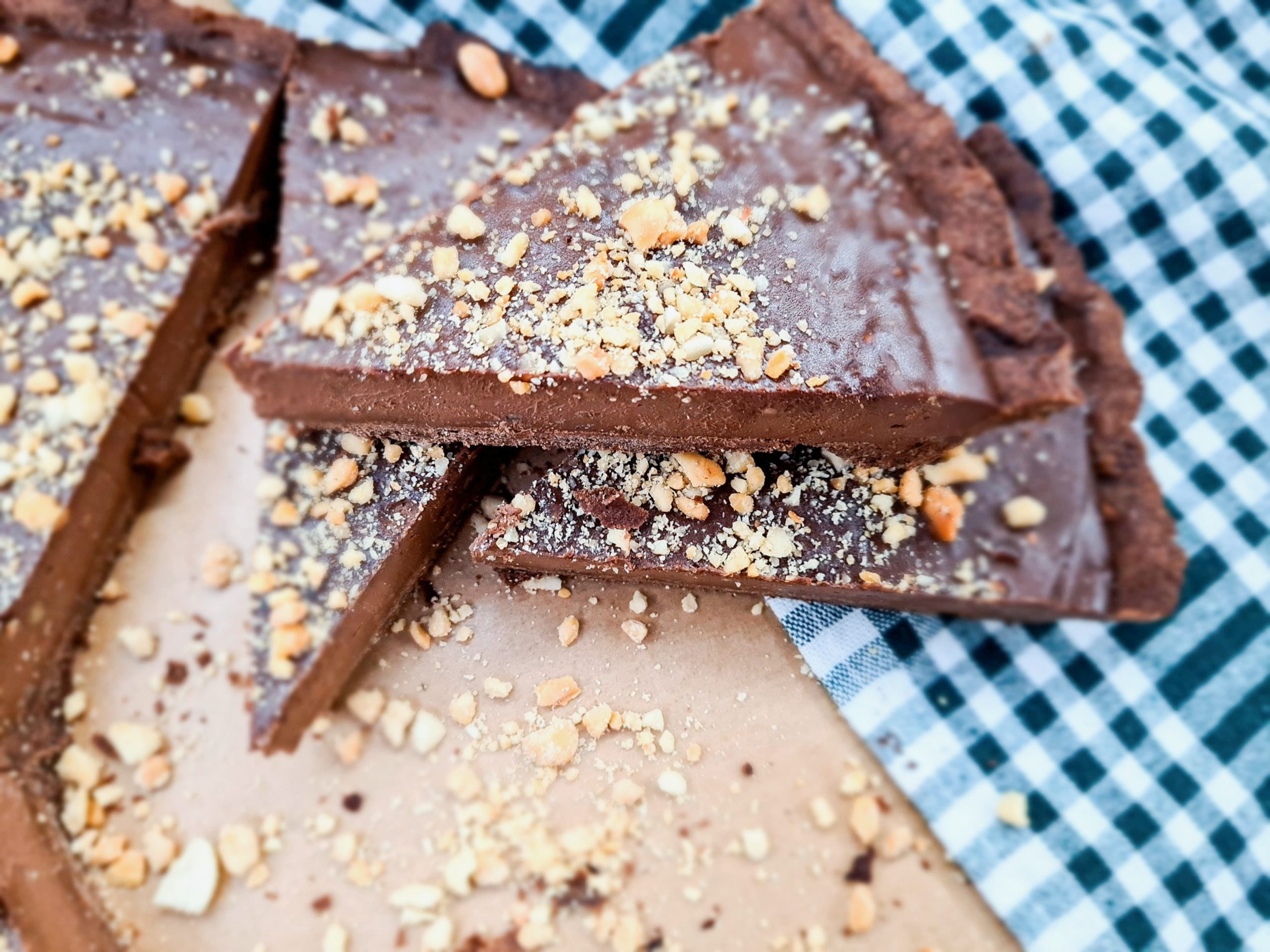 За подготовка на кремот ставете го кокосовото млеко и чоколадото на тивок оган и убаво соединете ги, во оваа смеса на крај додадете го путерот од кикиритки и мелените кикиритки и истурете го кремот врз кората. Одозгора јас си наросив уште малку мелени кикиритки.