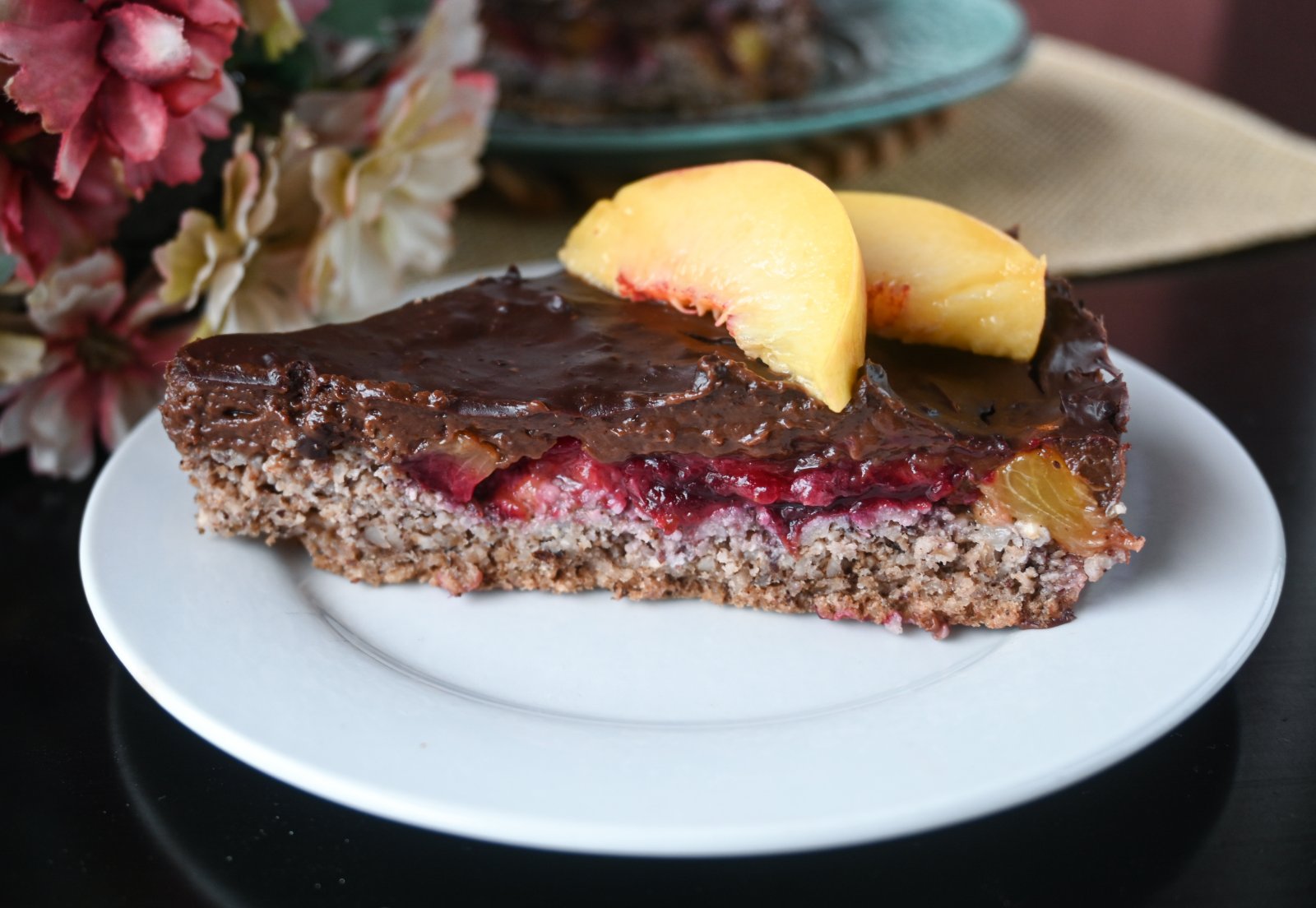 За подготовка на чоко филот сварете го пудингот на стандарден начин само што наместо 500 ml млеко користете 300 ml за да биде погусто. Кога ќе биде готов пудингот, додадете го темното чоколадо и измешајте убаво. Истурете ја оваа чоко смеса врз сливите и оставете да се излади и стегне.