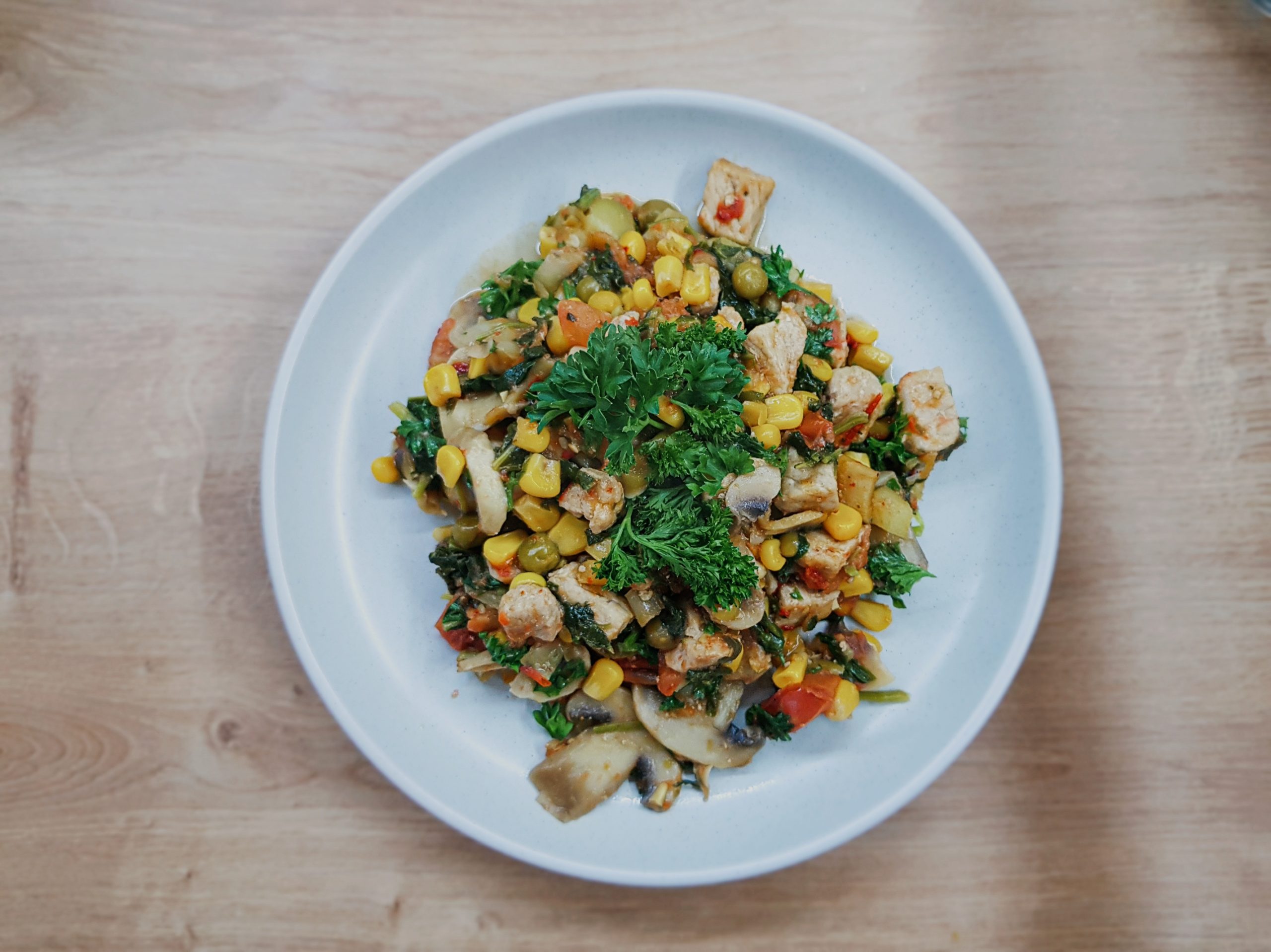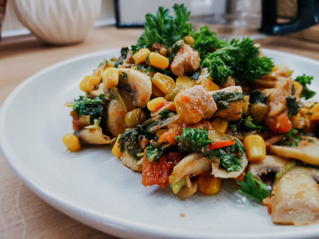 Месото го насечкав на ситни коцки и го ставив во длабока тава со малку маслиново масло да се запржи/динста. Тоа не пржење затоа што ставам многу малку масло и самото месо си пушта вода па се динста во сопствената течност. Кога малку зарумени ги додадов кромидот, пиперката, шампињоните и морковот. Го оставив неколку минути. Зеленчукот си пушти и плус вода па имаше доволно за да се динста на тивко. Кога и зеленчукот малку омекна ја додадов пченката, грашокот и доматот кој го насечкав на коцки. Оставив неколку минути доматот да пушти убаво течност па го додадов спанаќот и готвев уште 4-5 минути максимум. Целата постапка беше можеби 30-тина минути највеќе иако не гледав саат па не сум сигурна, може било и побрзо.