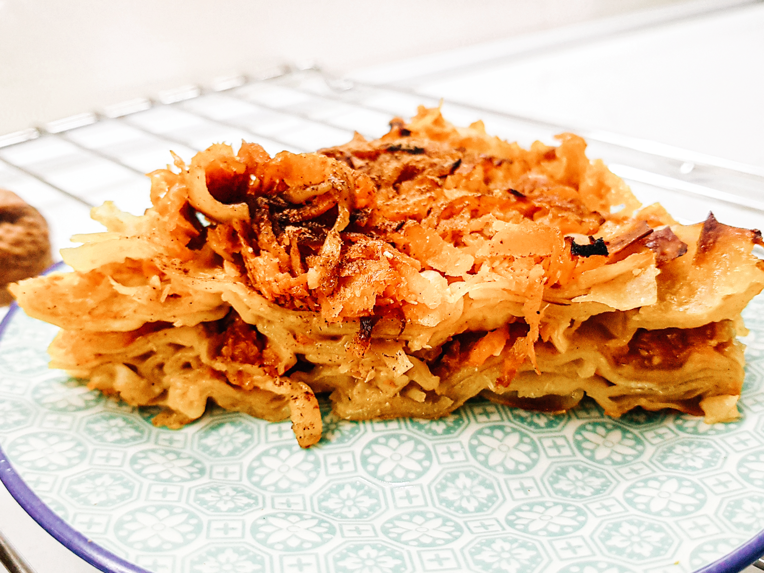Во кружен плех попрскав малку маслиново масло и ставив еден ред јуфки, врз нив попрскав уште малку масло и ставив пола од смесата со тиква. Одозгора пак ред јуфки и пак малку маслиново масло. Последен ред беше преостанатиот дел од ренданата тиква. На крај наросив малку кокосов шеќер и го прелив тикварникот со загреаното кокосово млеко.