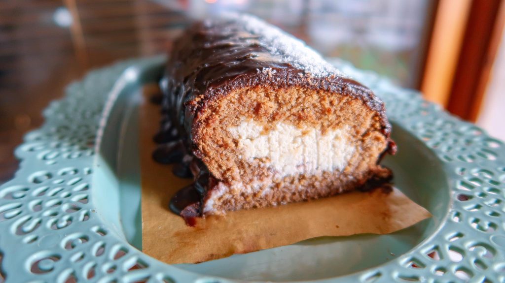 Потоа готовото тесто извадете го од рерна и покријте го со мокра крпа, па завиткајте во форма на ролат и оставете малку да се олади. Со овој чекор му ја даваме на тестото посакуваната форма, за да можеме после да го филуваме.