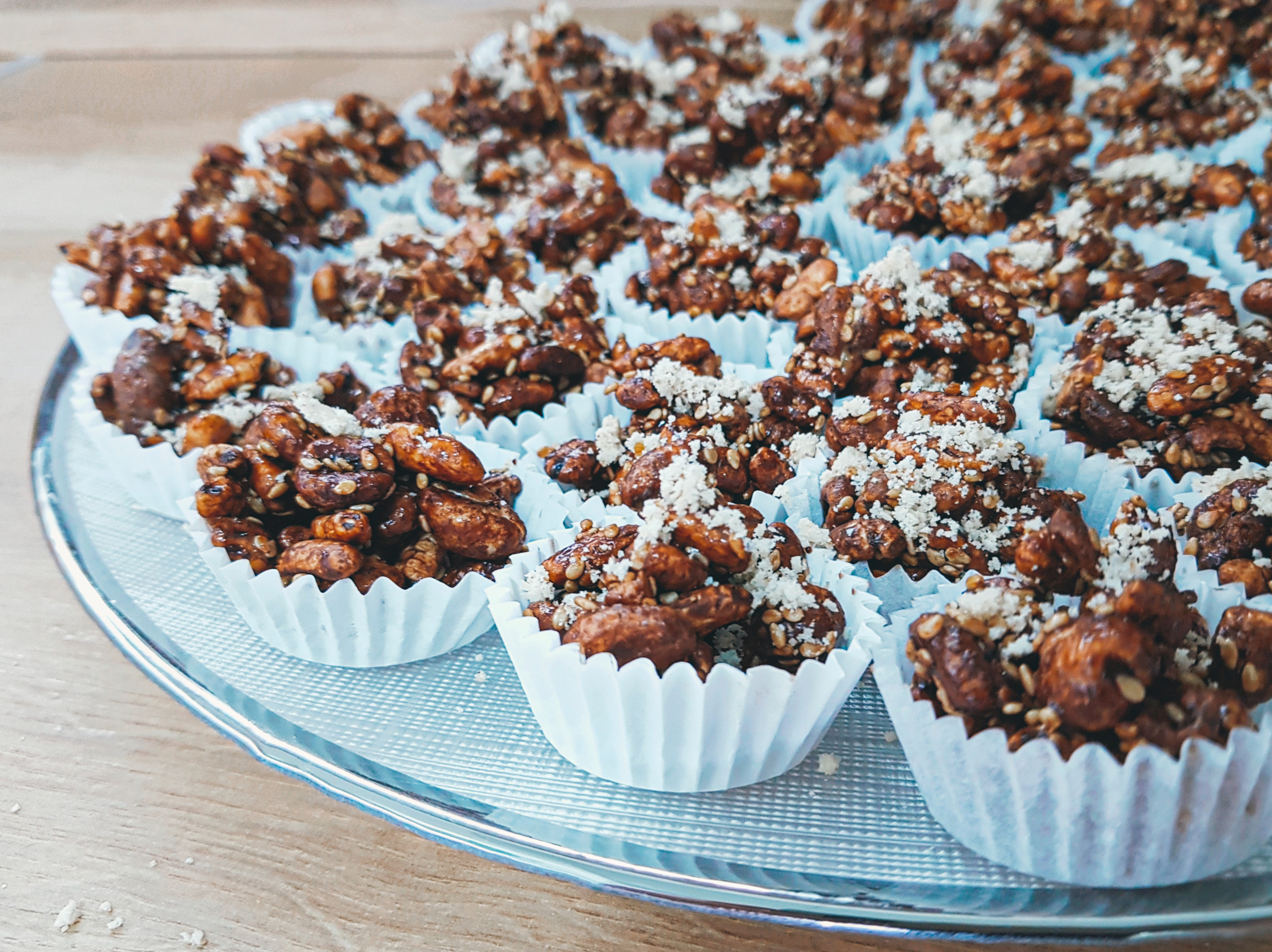 Не е ова некој генијален рецепт, но пробав да го адаптирам во здрава верзија и можам да кажам дека успеав. Добив многу голема количина. Наполнив 30 мали корпички за колачи и ми се здосади од полнење, па остатокот (уште половина) го натапкав во правоаголно плехче. Тоа излезе како чоколадо со експандиран ориз и ќе го кршиме и така ќе го јадеме.