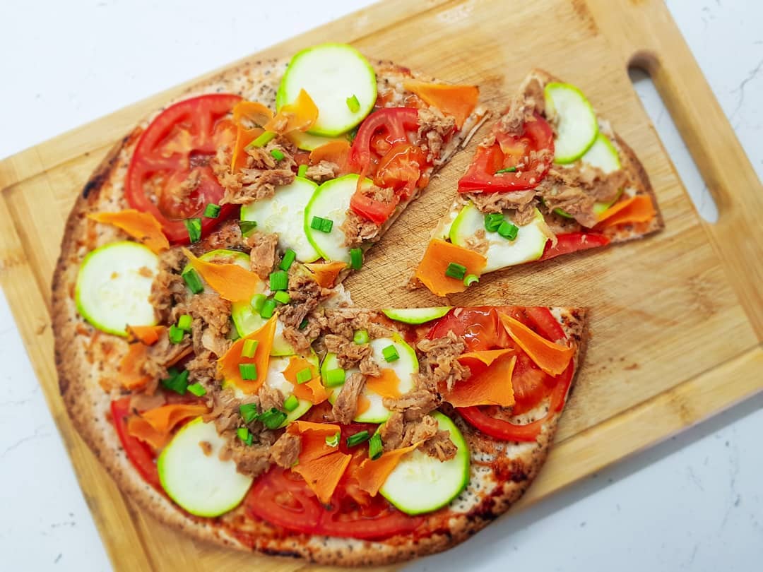 Во оваа варијанта јас искористив туна, тиквички, морков, домат и наросив со млад кромид. Но вие можете да искористите што било! Премачкајте со путер или маслиново, ставете ги омилените зеленчуци, маслинки, печурки и наросете малку моцарела. Печете кратко.